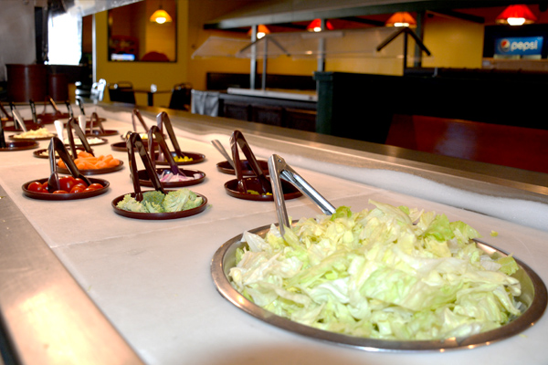 a mixture of iceberg and romaine lettuce, tomato, red onions, cheddar cheese and banana peppers, with Zias Sweet Italian dressing.