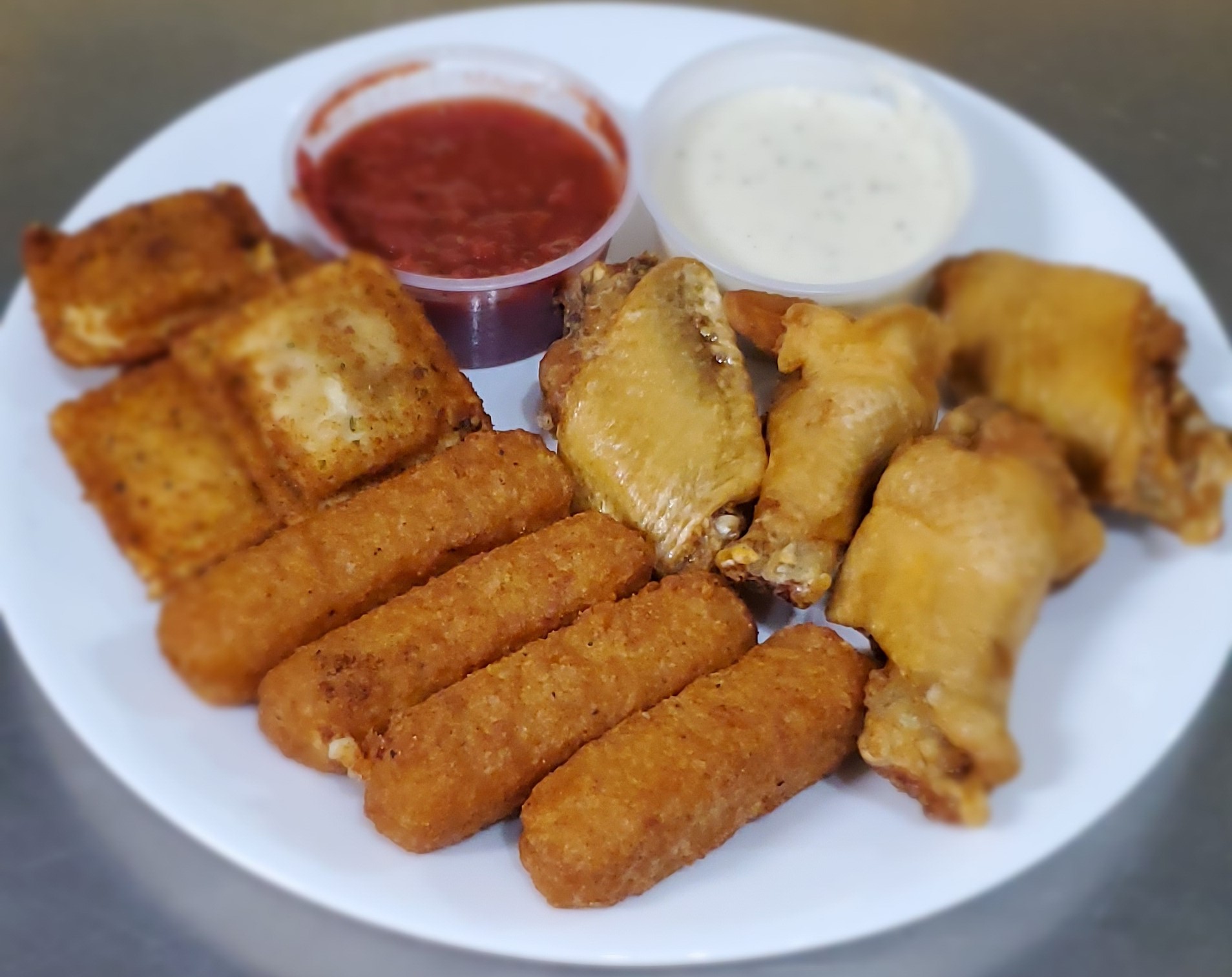 4 cheese sticks, 4 hot wings, 4 toasted. ravioli w/red sauce